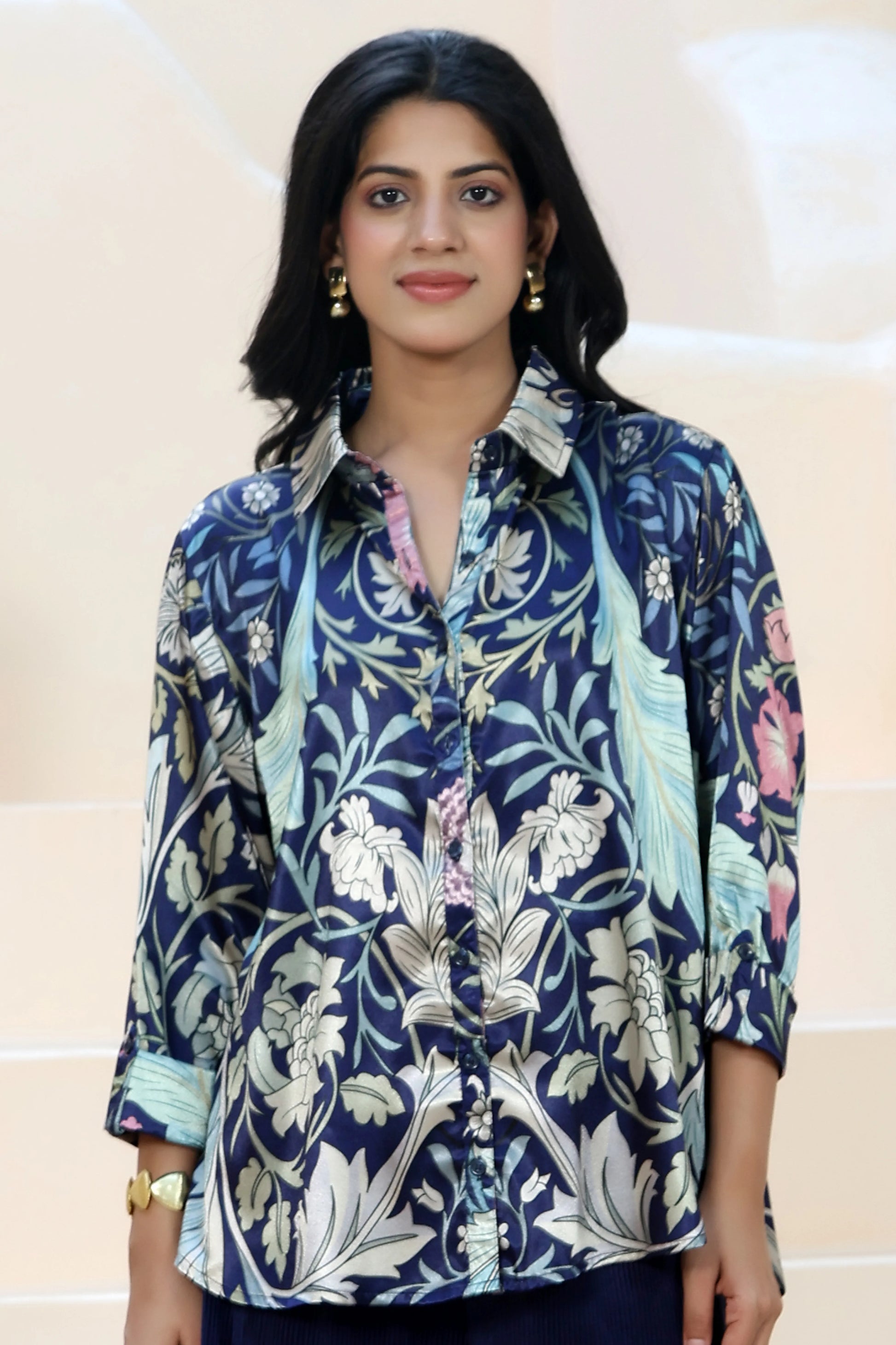 A luminous printed satin creation that captures the glow of dusk. Adorned with gleaming golden buttons, it drapes elegantly, exuding timeless charm and quiet sophistication.