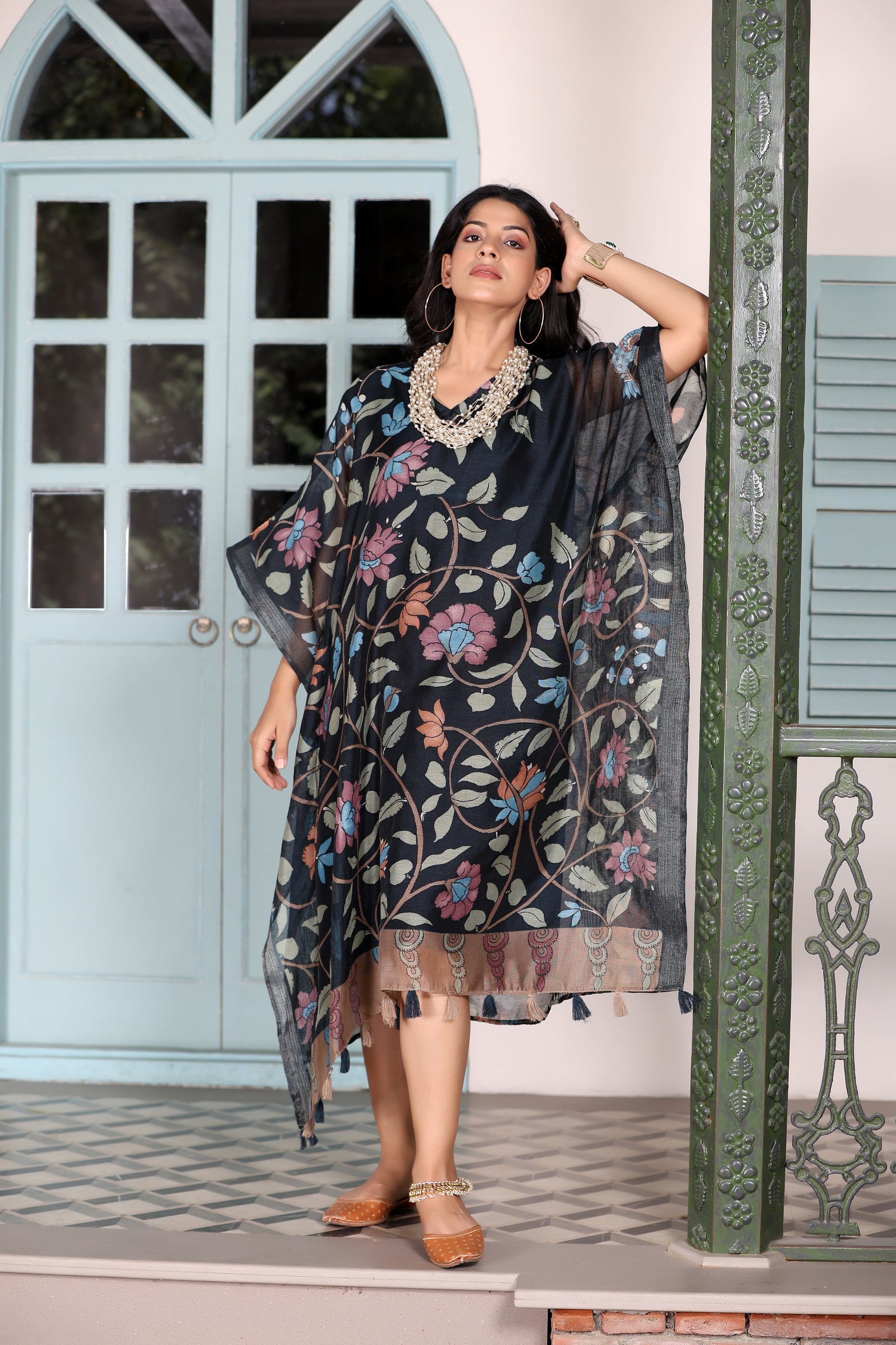 Kaftan crafted in exquisite Maheshwari saree-inspired prints, paired with soft cotton inners for added comfort. A luxurious blend of tradition and ease, it drapes beautifully — perfect for refined resort wear or elegant evenings. The Kaftan comes with a cotton slip.