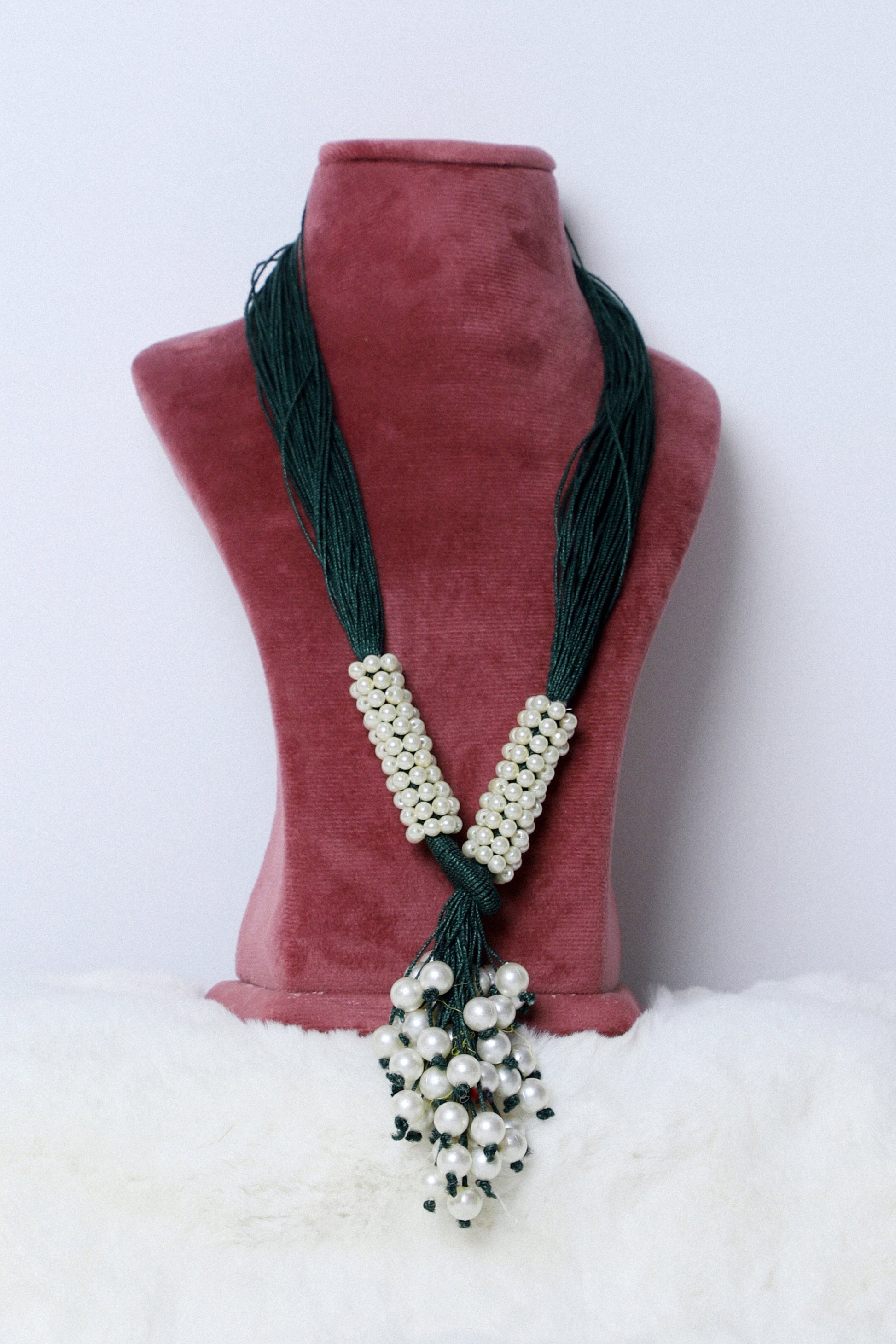 A rustic jute necklace finished with a delicate bunch of pearls at the end, clustered like grapes—organic, elegant, and effortlessly gorgeous, blending raw texture with soft, timeless beauty.