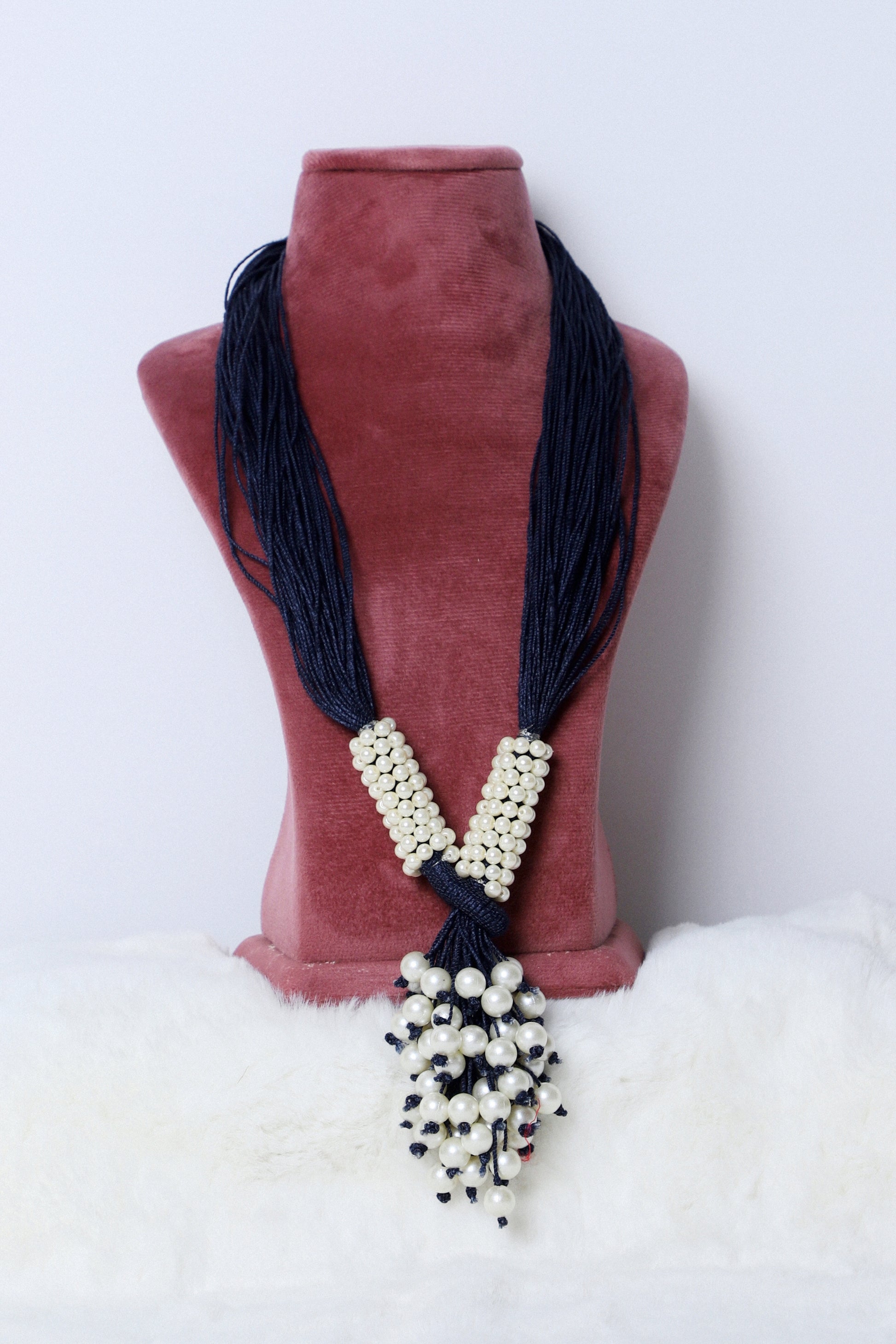 A rustic jute necklace finished with a delicate bunch of pearls at the end, clustered like grapes—organic, elegant, and effortlessly gorgeous, blending raw texture with soft, timeless beauty.