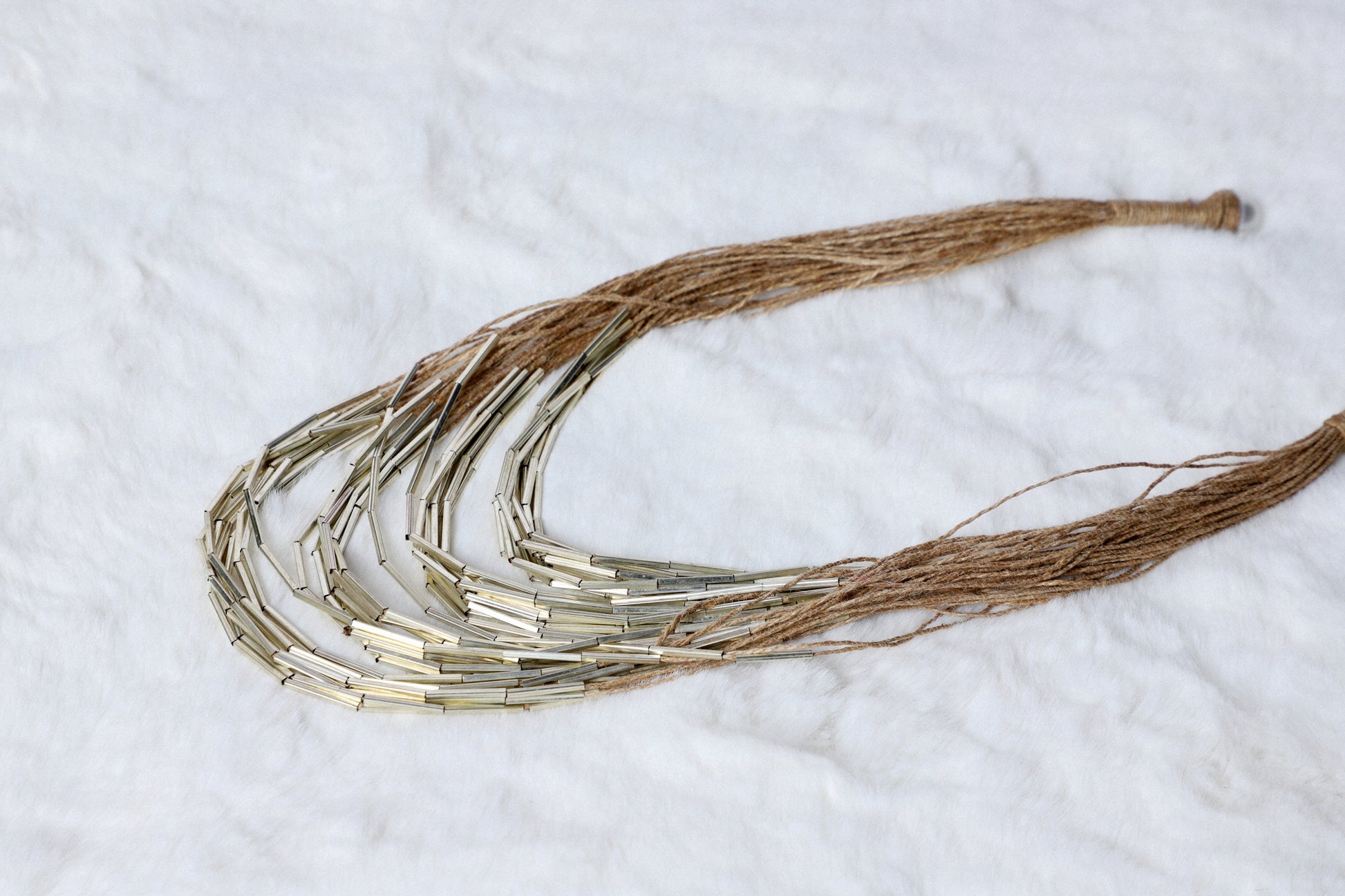A delicate necklace where silver pipes are intricately strung on soft jute threads, creating a lustrous, lightweight adornment. The combination of rustic jute and gleaming silver gives it a subtle elegance, perfect for both casual and festive outfits.