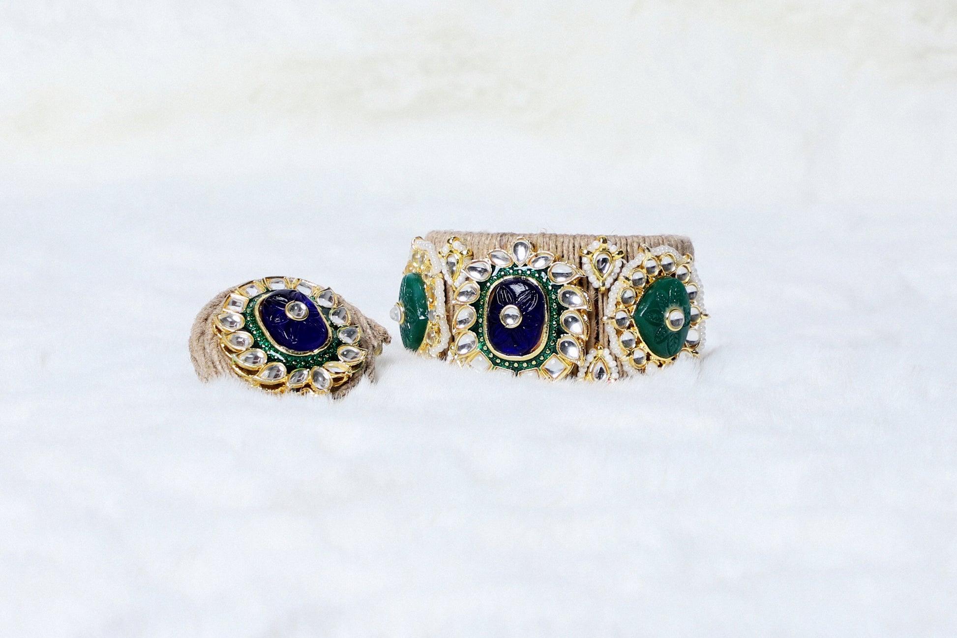 A Kundan bracelet and ring set features intricately set Kundan stones that shimmer with regal elegance. Designed to complement each other perfectly, this set adds a touch of timeless sophistication and sparkling charm to any festive or special occasion outfit.