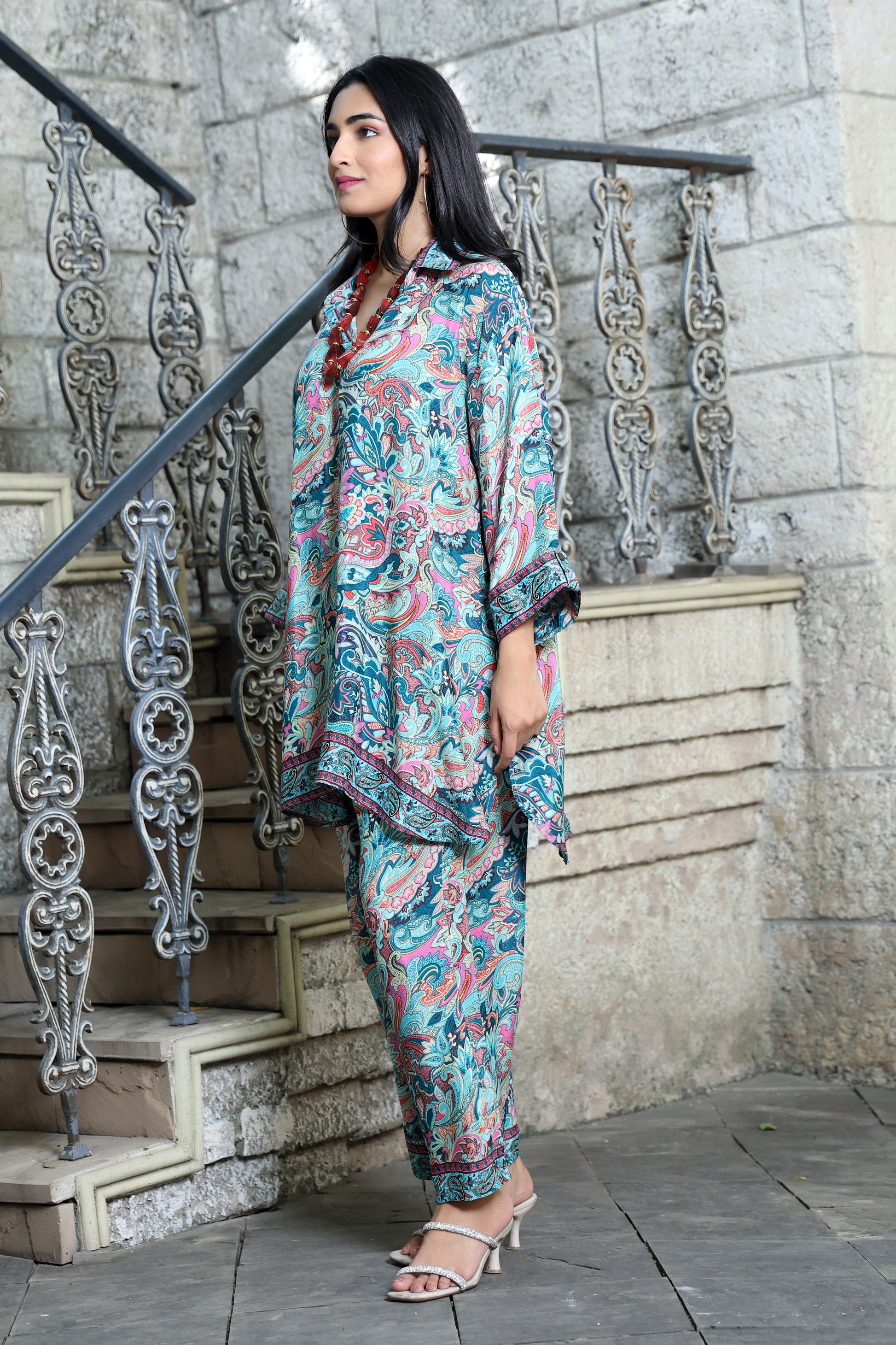 Signature co-ord sets featuring a smart collared top in beautiful statement prints and easy-fit pants with an elastic waistband and adjustable drawstring tie. Light, breathable, and effortlessly chic, they redefine everyday comfort with elevated style.