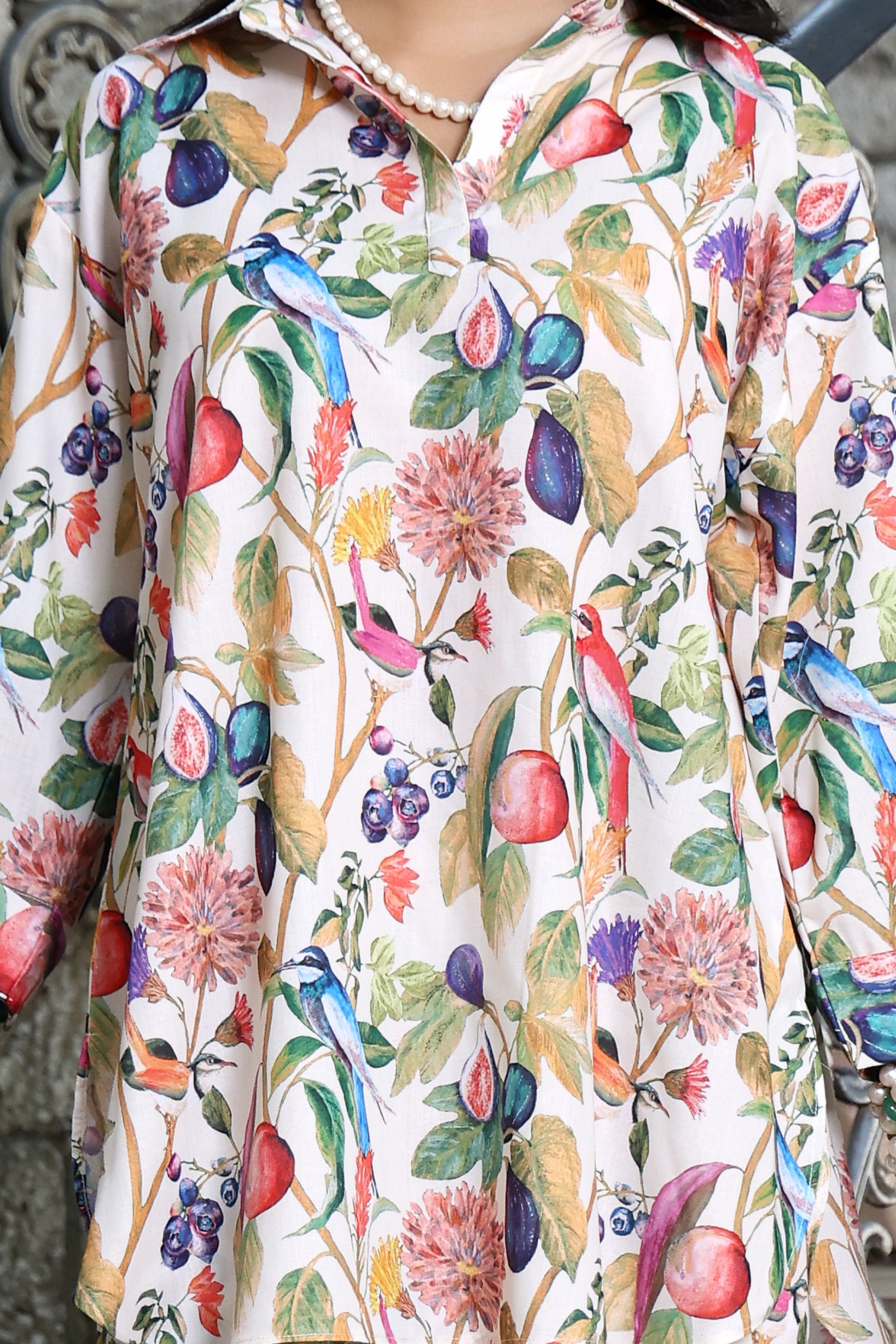 Signature co-ord sets featuring a smart collared top in beautiful statement prints and easy-fit pants with an elastic waistband and adjustable drawstring tie. Light, breathable, and effortlessly chic, they redefine everyday comfort with elevated style.