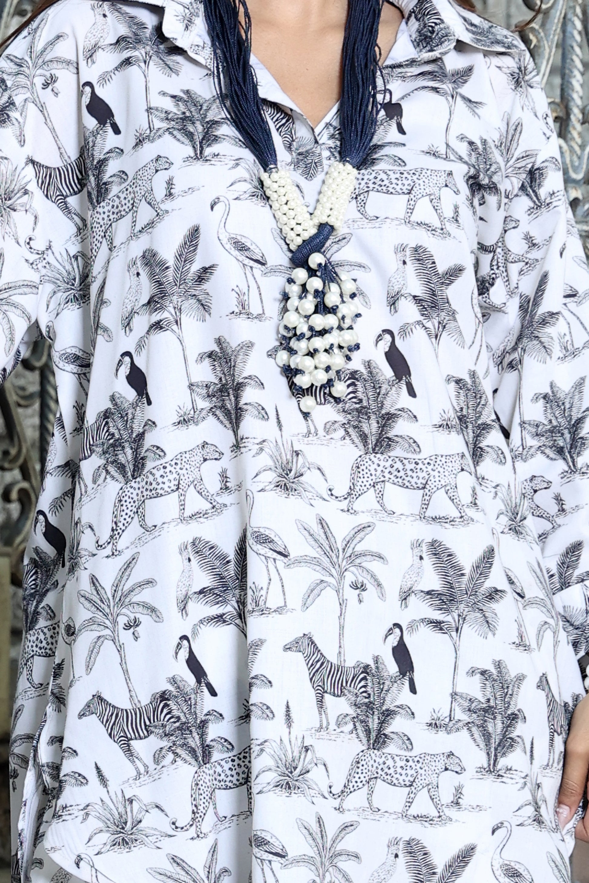 Signature co-ord sets featuring a smart collared top in beautiful statement prints and easy-fit pants with an elastic waistband and adjustable drawstring tie. Light, breathable, and effortlessly chic, they redefine everyday comfort with elevated style.